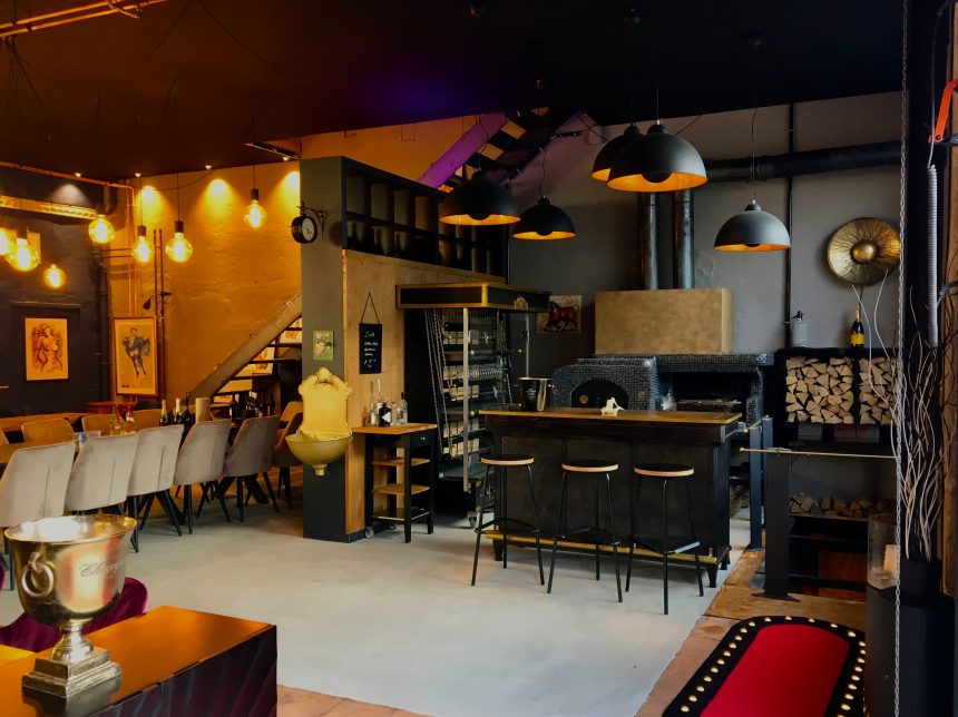 Industrial Chic trifft moderne Eventküche. Showküche sichtbar von allen Plätzen, Platz für bis zu 65 Gäste, gemütliche Atmosphäre mit eleganten Samt‑Polsterstühlen.